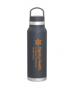 25 oz double wall 18/8 stainless steel thermal bottle with copper vacuum insulation, threaded insulated lid with carrying handle, high polish accent, stainless steel base, and powder coated finish. Hand wash recommended; Do not microwave. Dimensions: 10 H x 3".