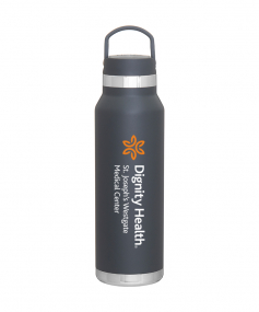 25 oz double wall 18/8 stainless steel thermal bottle with copper vacuum insulation, threaded insulated lid with carrying handle, high polish accent, stainless steel base, and powder coated finish. Hand wash recommended; Do not microwave. Dimensions: 10 H x 3".
