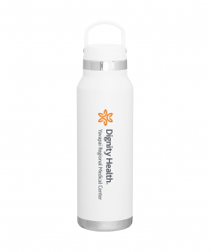 25 oz double wall 18/8 stainless steel thermal bottle with copper vacuum insulation, threaded insulated lid with carrying handle, high polish accent, stainless steel base, and powder coated finish. Hand wash recommended; Do not microwave. Dimensions: 10 H x 3".