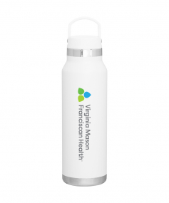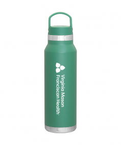 25 oz double wall 18/8 stainless steel thermal bottle with copper vacuum insulation, threaded insulated lid with carrying handle, high polish accent, stainless steel base, and powder coated finish. Hand wash recommended; Do not microwave. Dimensions: 10 H x 3".