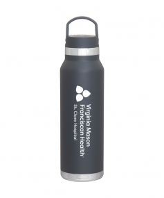 25 oz double wall 18/8 stainless steel thermal bottle with copper vacuum insulation, threaded insulated lid with carrying handle, high polish accent, stainless steel base, and powder coated finish. Hand wash recommended; Do not microwave. Dimensions: 10 H x 3".