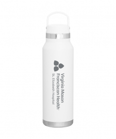 25 oz double wall 18/8 stainless steel thermal bottle with copper vacuum insulation, threaded insulated lid with carrying handle, high polish accent, stainless steel base, and powder coated finish. Hand wash recommended; Do not microwave. Dimensions: 10 H x 3".