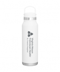 25 oz double wall 18/8 stainless steel thermal bottle with copper vacuum insulation, threaded insulated lid with carrying handle, high polish accent, stainless steel base, and powder coated finish. Hand wash recommended; Do not microwave. Dimensions: 10 H x 3".