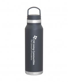 25 oz double wall 18/8 stainless steel thermal bottle with copper vacuum insulation, threaded insulated lid with carrying handle, high polish accent, stainless steel base, and powder coated finish. Hand wash recommended; Do not microwave. Dimensions: 10 H x 3".