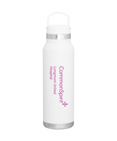 25 oz double wall 18/8 stainless steel thermal bottle with copper vacuum insulation, threaded insulated lid with carrying handle, high polish accent, stainless steel base, and powder coated finish. Hand wash recommended; Do not microwave. Dimensions: 10 H x 3".
