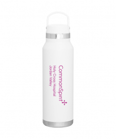 25 oz double wall 18/8 stainless steel thermal bottle with copper vacuum insulation, threaded insulated lid with carrying handle, high polish accent, stainless steel base, and powder coated finish. Hand wash recommended; Do not microwave. Dimensions: 10 H x 3".