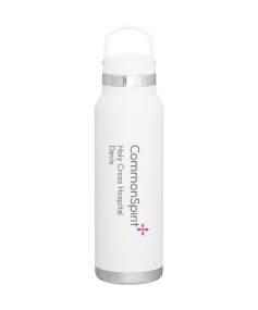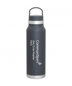 25 oz double wall 18/8 stainless steel thermal bottle with copper vacuum insulation, threaded insulated lid with carrying handle, high polish accent, stainless steel base, and powder coated finish. Hand wash recommended; Do not microwave. Dimensions: 10 H x 3".