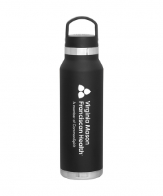25 oz double wall 18/8 stainless steel thermal bottle with copper vacuum insulation, threaded insulated lid with carrying handle, high polish accent, stainless steel base, and powder coated finish. Hand wash recommended; Do not microwave. Dimensions: 10 H x 3".