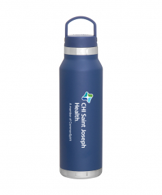 25 oz double wall 18/8 stainless steel thermal bottle with copper vacuum insulation, threaded insulated lid with carrying handle, high polish accent, stainless steel base, and powder coated finish. Hand wash recommended; Do not microwave. Dimensions: 10 H x 3".