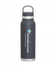 25 oz double wall 18/8 stainless steel thermal bottle with copper vacuum insulation, threaded insulated lid with carrying handle, high polish accent, stainless steel base, and powder coated finish. Hand wash recommended; Do not microwave. Dimensions: 10 H x 3".