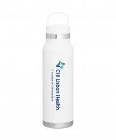 25 oz double wall 18/8 stainless steel thermal bottle with copper vacuum insulation, threaded insulated lid with carrying handle, high polish accent, stainless steel base, and powder coated finish. Hand wash recommended; Do not microwave. Dimensions: 10 H x 3".