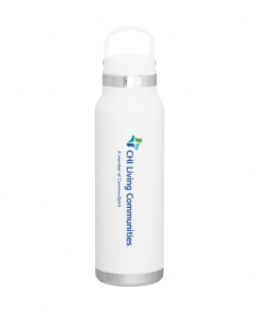 25 oz double wall 18/8 stainless steel thermal bottle with copper vacuum insulation, threaded insulated lid with carrying handle, high polish accent, stainless steel base, and powder coated finish. Hand wash recommended; Do not microwave. Dimensions: 10 H x 3".