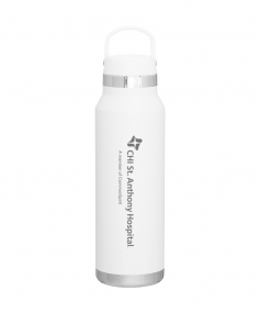 25 oz double wall 18/8 stainless steel thermal bottle with copper vacuum insulation, threaded insulated lid with carrying handle, high polish accent, stainless steel base, and powder coated finish. Hand wash recommended; Do not microwave. Dimensions: 10 H x 3".