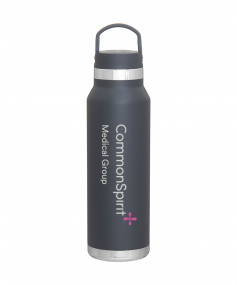 25 oz double wall 18/8 stainless steel thermal bottle with copper vacuum insulation, threaded insulated lid with carrying handle, high polish accent, stainless steel base, and powder coated finish. Hand wash recommended; Do not microwave. Dimensions: 10 H x 3".