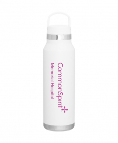 25 oz double wall 18/8 stainless steel thermal bottle with copper vacuum insulation, threaded insulated lid with carrying handle, high polish accent, stainless steel base, and powder coated finish. Hand wash recommended; Do not microwave. Dimensions: 10 H x 3".