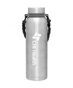 32 oz double wall 18/8 stainless steel thermal bottle with copper vacuum insulation, insulated stainless steel threaded lid, silicone ring, removable strap with buckles, removable clasps, and powder coated finish. Individual gift box. Hand wash recommended. Do not microwave. Complies with FDA, Prop 65. 11" H x 3.1875" W