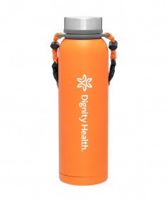 32 oz double wall 18/8 stainless steel thermal bottle with copper vacuum insulation, insulated stainless steel threaded lid, silicone ring, removable strap with buckles, removable clasps, and powder coated finish. Individual gift box. Hand wash recommended. Do not microwave. Complies with FDA, Prop 65. 11" H x 3.1875" W