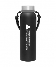 32 oz double wall 18/8 stainless steel thermal bottle with copper vacuum insulation, insulated stainless steel threaded lid, silicone ring, removable strap with buckles, removable clasps, and powder coated finish. Individual gift box. Hand wash recommended. Do not microwave. Complies with FDA, Prop 65. 11" H x 3.1875" W