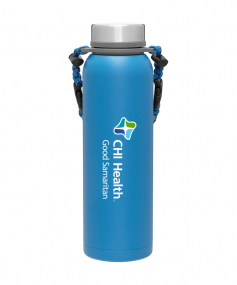 32 oz double wall 18/8 stainless steel thermal bottle with copper vacuum insulation, insulated stainless steel threaded lid, silicone ring, removable strap with buckles, removable clasps, and powder coated finish. Individual gift box. Hand wash recommended. Do not microwave. Complies with FDA, Prop 65. 11" H x 3.1875" W