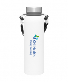 32 oz double wall 18/8 stainless steel thermal bottle with copper vacuum insulation, insulated stainless steel threaded lid, silicone ring, removable strap with buckles, removable clasps, and powder coated finish. Individual gift box. Hand wash recommended. Do not microwave. Complies with FDA, Prop 65. 11" H x 3.1875" W