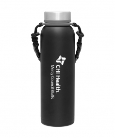32 oz double wall 18/8 stainless steel thermal bottle with copper vacuum insulation, insulated stainless steel threaded lid, silicone ring, removable strap with buckles, removable clasps, and powder coated finish. Individual gift box. Hand wash recommended. Do not microwave. Complies with FDA, Prop 65. 11" H x 3.1875" W