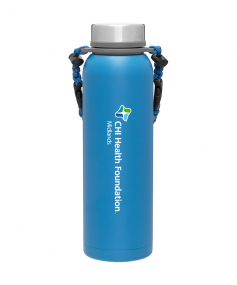 32 oz double wall 18/8 stainless steel thermal bottle with copper vacuum insulation, insulated stainless steel threaded lid, silicone ring, removable strap with buckles, removable clasps, and powder coated finish. Individual gift box. Hand wash recommended. Do not microwave. Complies with FDA, Prop 65. 11" H x 3.1875" W