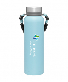 32 oz double wall 18/8 stainless steel thermal bottle with copper vacuum insulation, insulated stainless steel threaded lid, silicone ring, removable strap with buckles, removable clasps, and powder coated finish. Individual gift box. Hand wash recommended. Do not microwave. Complies with FDA, Prop 65. 11" H x 3.1875" W