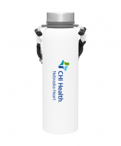 32 oz double wall 18/8 stainless steel thermal bottle with copper vacuum insulation, insulated stainless steel threaded lid, silicone ring, removable strap with buckles, removable clasps, and powder coated finish. Individual gift box. Hand wash recommended. Do not microwave. Complies with FDA, Prop 65. 11" H x 3.1875" W