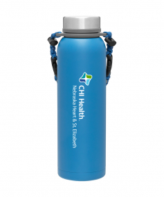 32 oz double wall 18/8 stainless steel thermal bottle with copper vacuum insulation, insulated stainless steel threaded lid, silicone ring, removable strap with buckles, removable clasps, and powder coated finish. Individual gift box. Hand wash recommended. Do not microwave. Complies with FDA, Prop 65. 11" H x 3.1875" W