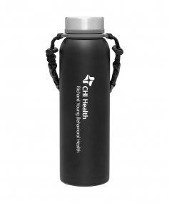 32 oz double wall 18/8 stainless steel thermal bottle with copper vacuum insulation, insulated stainless steel threaded lid, silicone ring, removable strap with buckles, removable clasps, and powder coated finish. Individual gift box. Hand wash recommended. Do not microwave. Complies with FDA, Prop 65. 11" H x 3.1875" W