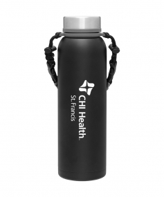 32 oz double wall 18/8 stainless steel thermal bottle with copper vacuum insulation, insulated stainless steel threaded lid, silicone ring, removable strap with buckles, removable clasps, and powder coated finish. Individual gift box. Hand wash recommended. Do not microwave. Complies with FDA, Prop 65. 11" H x 3.1875" W