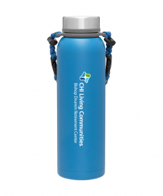 32 oz double wall 18/8 stainless steel thermal bottle with copper vacuum insulation, insulated stainless steel threaded lid, silicone ring, removable strap with buckles, removable clasps, and powder coated finish. Individual gift box. Hand wash recommended. Do not microwave. Complies with FDA, Prop 65. 11" H x 3.1875" W
