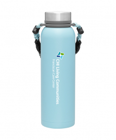 32 oz double wall 18/8 stainless steel thermal bottle with copper vacuum insulation, insulated stainless steel threaded lid, silicone ring, removable strap with buckles, removable clasps, and powder coated finish. Individual gift box. Hand wash recommended. Do not microwave. Complies with FDA, Prop 65. 11" H x 3.1875" W
