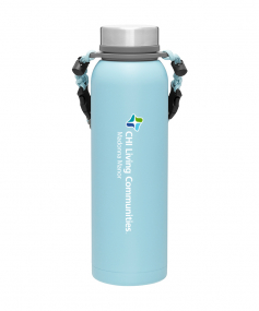 32 oz double wall 18/8 stainless steel thermal bottle with copper vacuum insulation, insulated stainless steel threaded lid, silicone ring, removable strap with buckles, removable clasps, and powder coated finish. Individual gift box. Hand wash recommended. Do not microwave. Complies with FDA, Prop 65. 11" H x 3.1875" W