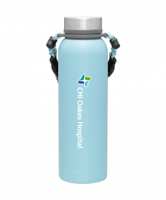 32 oz double wall 18/8 stainless steel thermal bottle with copper vacuum insulation, insulated stainless steel threaded lid, silicone ring, removable strap with buckles, removable clasps, and powder coated finish. Individual gift box. Hand wash recommended. Do not microwave. Complies with FDA, Prop 65. 11" H x 3.1875" W