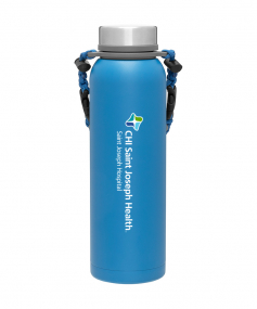 32 oz double wall 18/8 stainless steel thermal bottle with copper vacuum insulation, insulated stainless steel threaded lid, silicone ring, removable strap with buckles, removable clasps, and powder coated finish. Individual gift box. Hand wash recommended. Do not microwave. Complies with FDA, Prop 65. 11" H x 3.1875" W