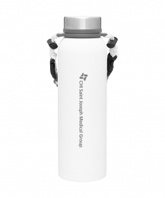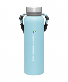 32 oz double wall 18/8 stainless steel thermal bottle with copper vacuum insulation, insulated stainless steel threaded lid, silicone ring, removable strap with buckles, removable clasps, and powder coated finish. Individual gift box. Hand wash recommended. Do not microwave. Complies with FDA, Prop 65. 11" H x 3.1875" W