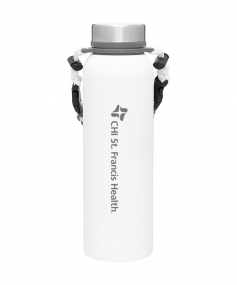 32 oz double wall 18/8 stainless steel thermal bottle with copper vacuum insulation, insulated stainless steel threaded lid, silicone ring, removable strap with buckles, removable clasps, and powder coated finish. Individual gift box. Hand wash recommended. Do not microwave. Complies with FDA, Prop 65. 11" H x 3.1875" W
