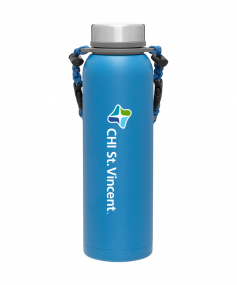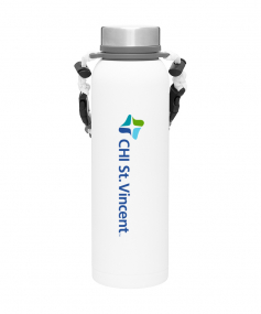 32 oz double wall 18/8 stainless steel thermal bottle with copper vacuum insulation, insulated stainless steel threaded lid, silicone ring, removable strap with buckles, removable clasps, and powder coated finish. Individual gift box. Hand wash recommended. Do not microwave. Complies with FDA, Prop 65. 11" H x 3.1875" W
