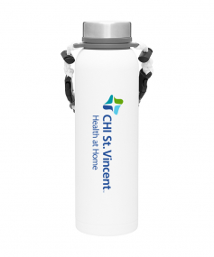 32 oz double wall 18/8 stainless steel thermal bottle with copper vacuum insulation, insulated stainless steel threaded lid, silicone ring, removable strap with buckles, removable clasps, and powder coated finish. Individual gift box. Hand wash recommended. Do not microwave. Complies with FDA, Prop 65. 11" H x 3.1875" W