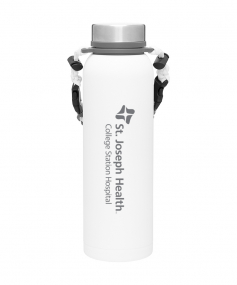 32 oz double wall 18/8 stainless steel thermal bottle with copper vacuum insulation, insulated stainless steel threaded lid, silicone ring, removable strap with buckles, removable clasps, and powder coated finish. Individual gift box. Hand wash recommended. Do not microwave. Complies with FDA, Prop 65. 11" H x 3.1875" W