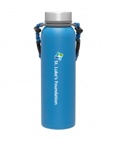 32 oz double wall 18/8 stainless steel thermal bottle with copper vacuum insulation, insulated stainless steel threaded lid, silicone ring, removable strap with buckles, removable clasps, and powder coated finish. Individual gift box. Hand wash recommended. Do not microwave. Complies with FDA, Prop 65. 11" H x 3.1875" W