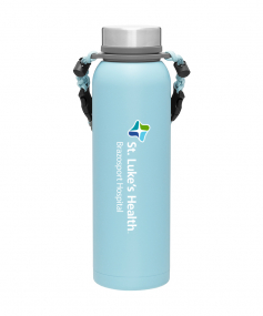 32 oz double wall 18/8 stainless steel thermal bottle with copper vacuum insulation, insulated stainless steel threaded lid, silicone ring, removable strap with buckles, removable clasps, and powder coated finish. Individual gift box. Hand wash recommended. Do not microwave. Complies with FDA, Prop 65. 11" H x 3.1875" W