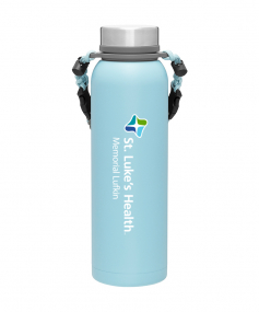 32 oz double wall 18/8 stainless steel thermal bottle with copper vacuum insulation, insulated stainless steel threaded lid, silicone ring, removable strap with buckles, removable clasps, and powder coated finish. Individual gift box. Hand wash recommended. Do not microwave. Complies with FDA, Prop 65. 11" H x 3.1875" W