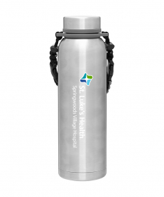 32 oz double wall 18/8 stainless steel thermal bottle with copper vacuum insulation, insulated stainless steel threaded lid, silicone ring, removable strap with buckles, removable clasps, and powder coated finish. Individual gift box. Hand wash recommended. Do not microwave. Complies with FDA, Prop 65. 11" H x 3.1875" W