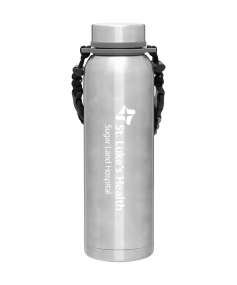 32 oz double wall 18/8 stainless steel thermal bottle with copper vacuum insulation, insulated stainless steel threaded lid, silicone ring, removable strap with buckles, removable clasps, and powder coated finish. Individual gift box. Hand wash recommended. Do not microwave. Complies with FDA, Prop 65. 11" H x 3.1875" W