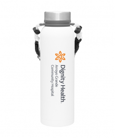 32 oz double wall 18/8 stainless steel thermal bottle with copper vacuum insulation, insulated stainless steel threaded lid, silicone ring, removable strap with buckles, removable clasps, and powder coated finish. Individual gift box. Hand wash recommended. Do not microwave. Complies with FDA, Prop 65. 11" H x 3.1875" W