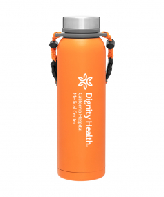 32 oz double wall 18/8 stainless steel thermal bottle with copper vacuum insulation, insulated stainless steel threaded lid, silicone ring, removable strap with buckles, removable clasps, and powder coated finish. Individual gift box. Hand wash recommended. Do not microwave. Complies with FDA, Prop 65. 11" H x 3.1875" W