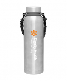 32 oz double wall 18/8 stainless steel thermal bottle with copper vacuum insulation, insulated stainless steel threaded lid, silicone ring, removable strap with buckles, removable clasps, and powder coated finish. Individual gift box. Hand wash recommended. Do not microwave. Complies with FDA, Prop 65. 11" H x 3.1875" W