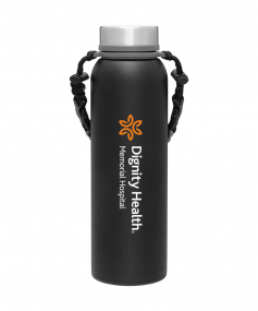 32 oz double wall 18/8 stainless steel thermal bottle with copper vacuum insulation, insulated stainless steel threaded lid, silicone ring, removable strap with buckles, removable clasps, and powder coated finish. Individual gift box. Hand wash recommended. Do not microwave. Complies with FDA, Prop 65. 11" H x 3.1875" W